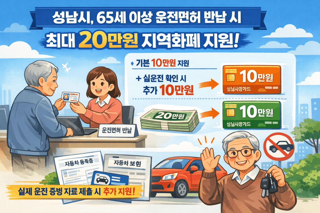 성남시(시장 신상진)가 올해부터 고령운전자의 운전면허 자진반납을 보다 실효성 있게 유도하기 위해 보상 제도를 개편한다. 성남시는 만 65세 이상 시민이 운전면허를 반납할 경우, 실제 운전 여부에 따라 최대 20만 원의 지역화폐를 지급하는 방식으로 지원 체계를 확대 시행한다고 밝혔다.