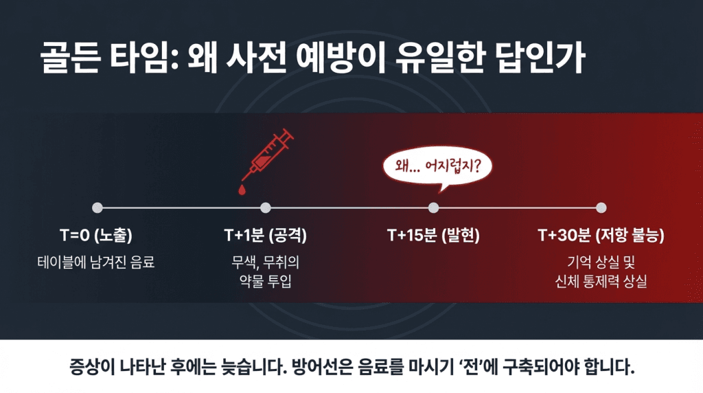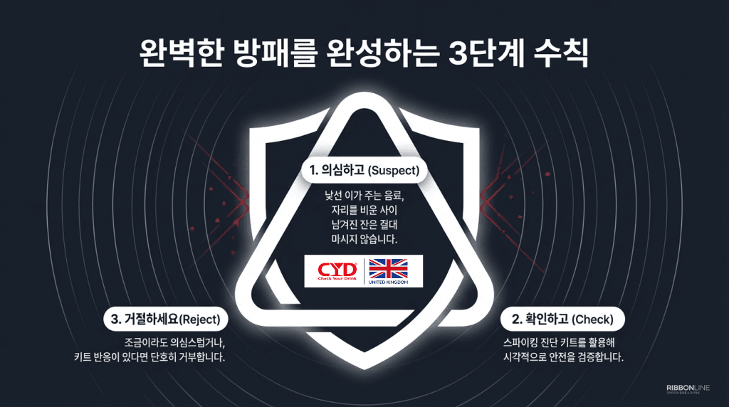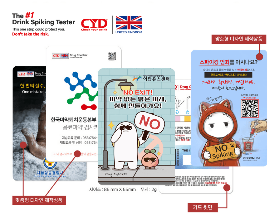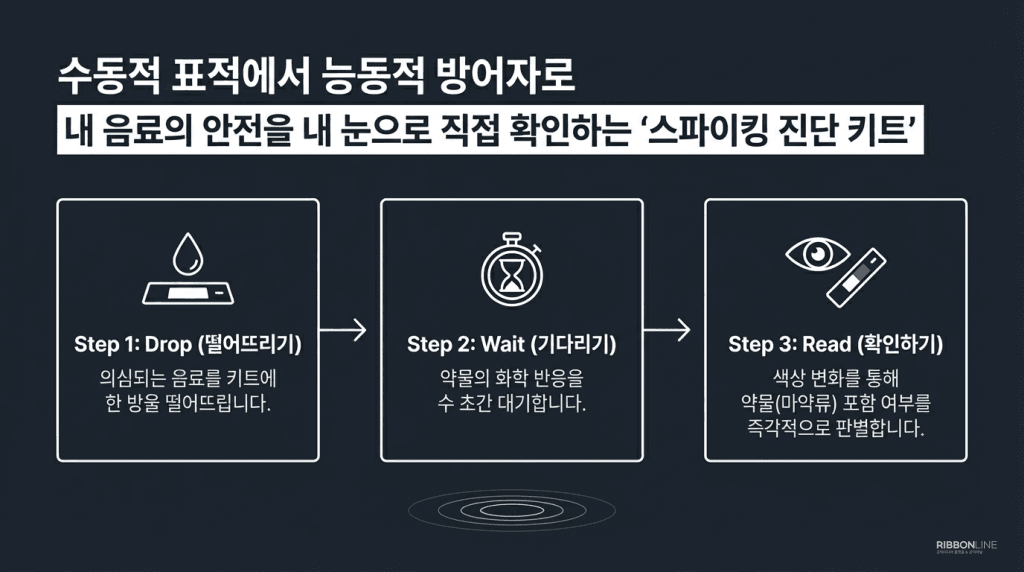 조치 사항: 음료가 바뀌었거나 이상한 맛이 난다면 즉시 마시는 것을 중단하고, 신뢰할 수 있는 사람(친구, 보안 요원 등)에게 알리라는 메시지를 담고 있습니다.